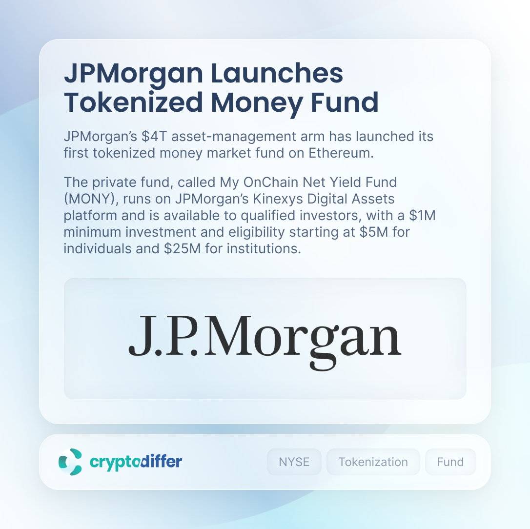 The private fund, called My OnChain Net Yield Fund (MONY), runs on JPMorgan’s Kinexys Digital Assets platform and is available to qualified investors, with a $1M minimum investment and eligibility starting at $5M for individuals and $25M for institutions.