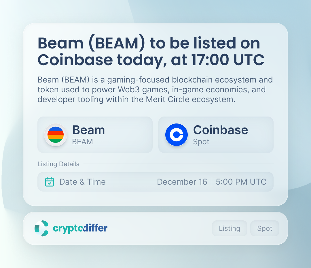 Beam (BEAM) gets listed on Coinbase today, on or after 17:00 UTC