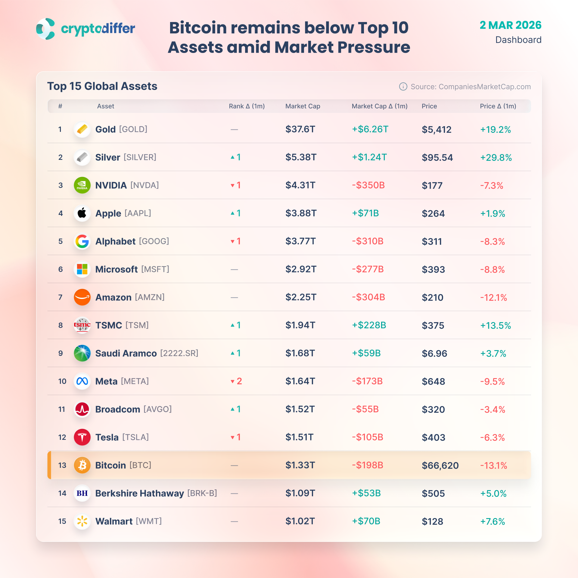 Bitcoin remains out of Top 10 Global Assets amid Market Pressure