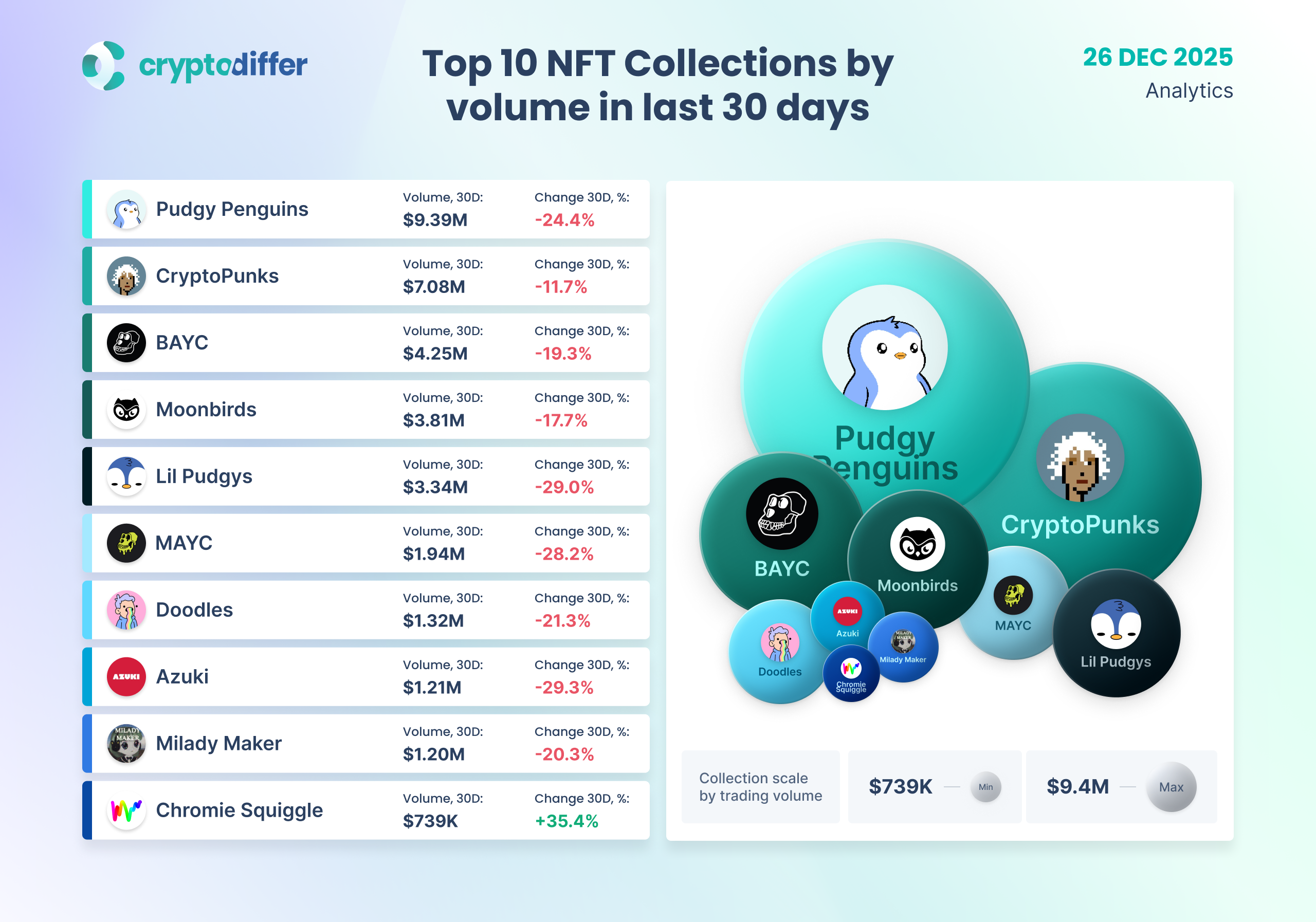 NFT trading activity continues to fall, with most top collections posting double-digit volume declines over the past 30 days. Pudgy Penguins and CryptoPunks still lead by volume, while Chromie Squiggle stands out as the only gainer.