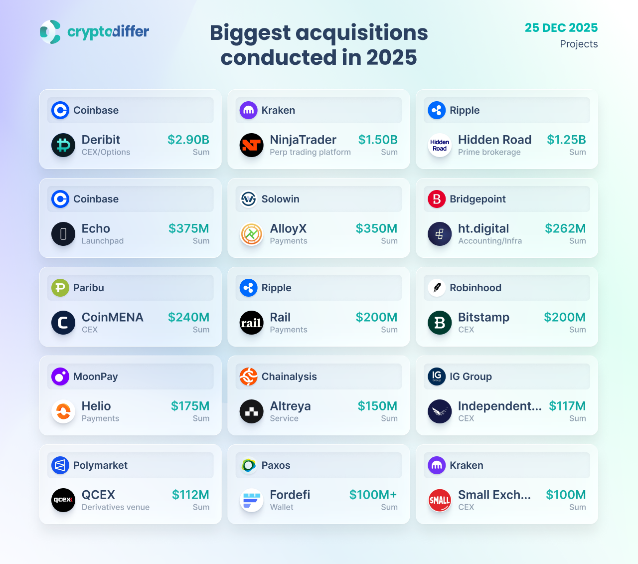 This year’s largest acquisitions highlight a clear trend - consolidation is accelerating across trading, custody, and payments. As regulation tightens and institutions grow, market leaders are buying capabilities rather than building from scratch.