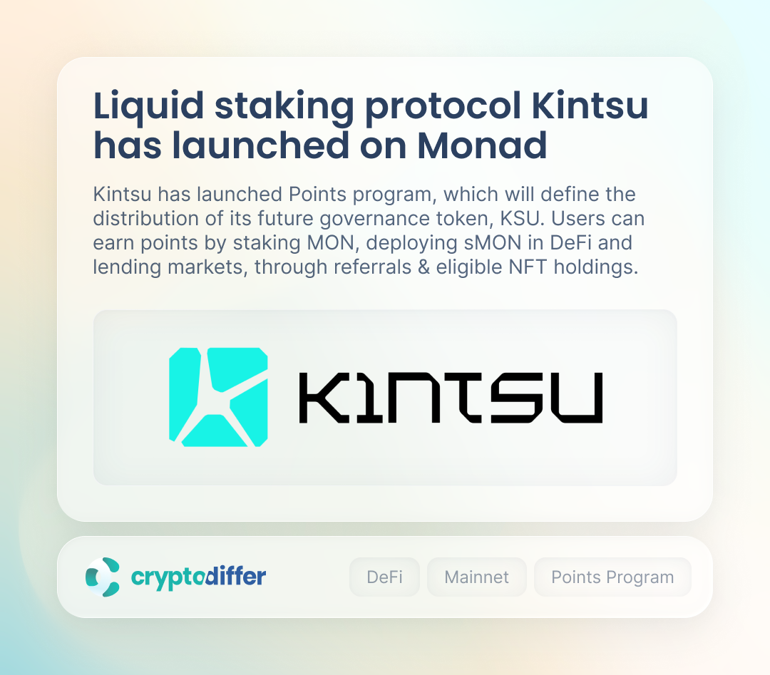 Kintsu has launched Points program, which will define the distribution of its future governance token, KSU. Users can earn points by staking MON, deploying sMON across DeFi and lending markets, through referrals and eligible NFT holdings.