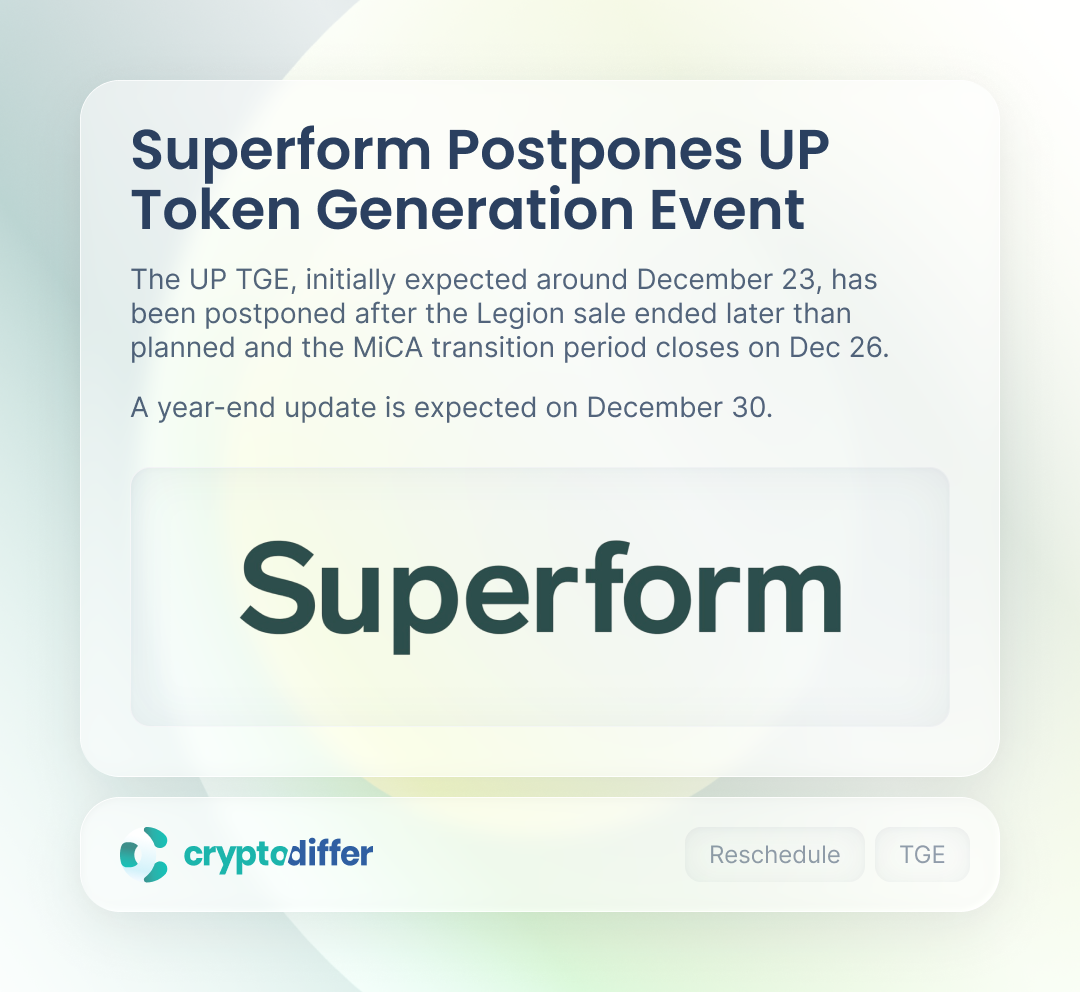 The UP TGE, initially expected around December 23, has been postponed after the Legion sale ended later than planned and the MiCA transition period closes on December 26. A year-end update is expected on December 30.