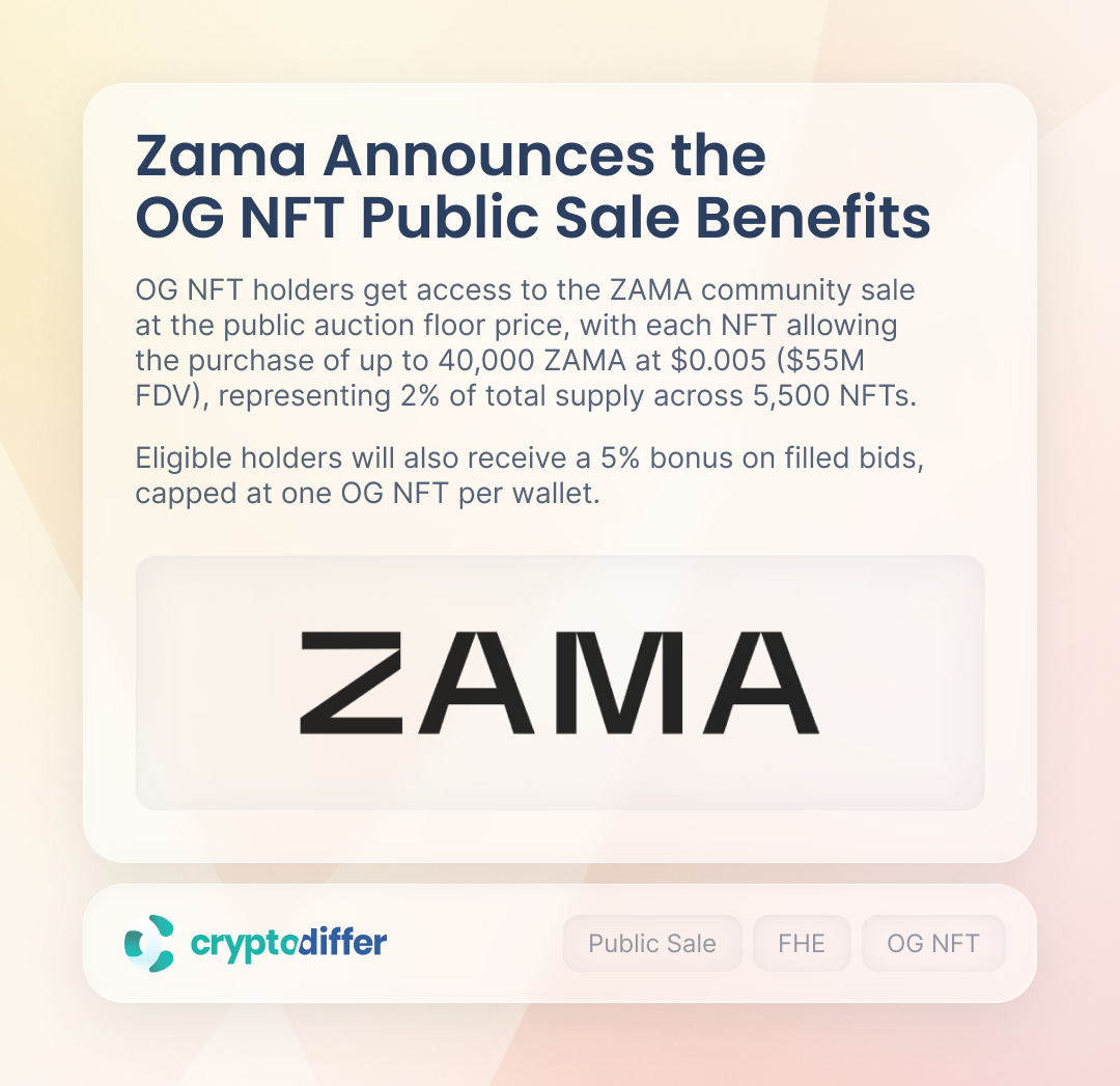 OG NFT holders get access to the ZAMA community sale at the public auction floor price, with each NFT allowing the purchase of up to 40,000 ZAMA at $0.005 ($55M FDV), representing 2% of total supply across 5,500 NFTs.