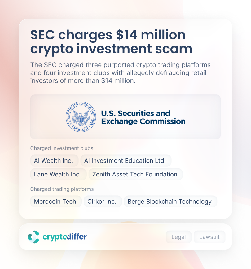 The SEC charged three crypto platforms and four investment clubs for allegedly running a social media–driven investment scam that defrauded retail investors of over $14 million.