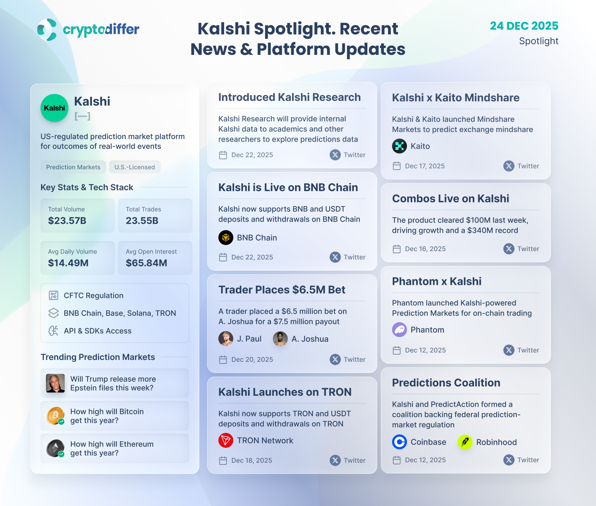 Kalshi continues to grow as a leading regulated prediction market, rolling out new features and forming partnerships and integrations with Coinbase, Robinhood, BNB Chain, Base, Phantom, and TRON. The platform has reached over $23B in total trading volume, with an average daily volume of $14M.