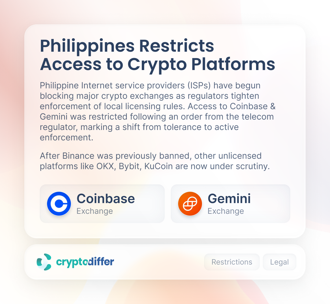 Philippine Internet service providers (ISPs) have begun blocking major crypto exchanges as regulators tighten enforcement of local licensing rules. Access to Coinbase & Gemini was restricted following an order from the telecom regulator, marking a shift from tolerance to active enforcement.