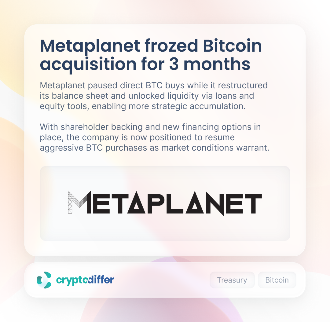 Metaplanet paused Bitcoin buys while restructuring its balance sheet and unlocking liquidity. With shareholder backing and new financing in place, it’s now positioned to resume Bitcoin accumulation when conditions align.