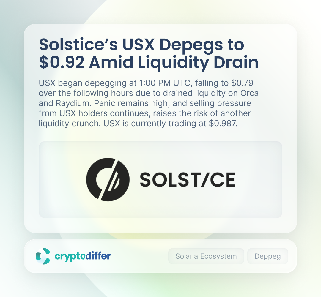 Solstice’s Stablecoin USX Depegs to $0.92 Following Liquidity Drain