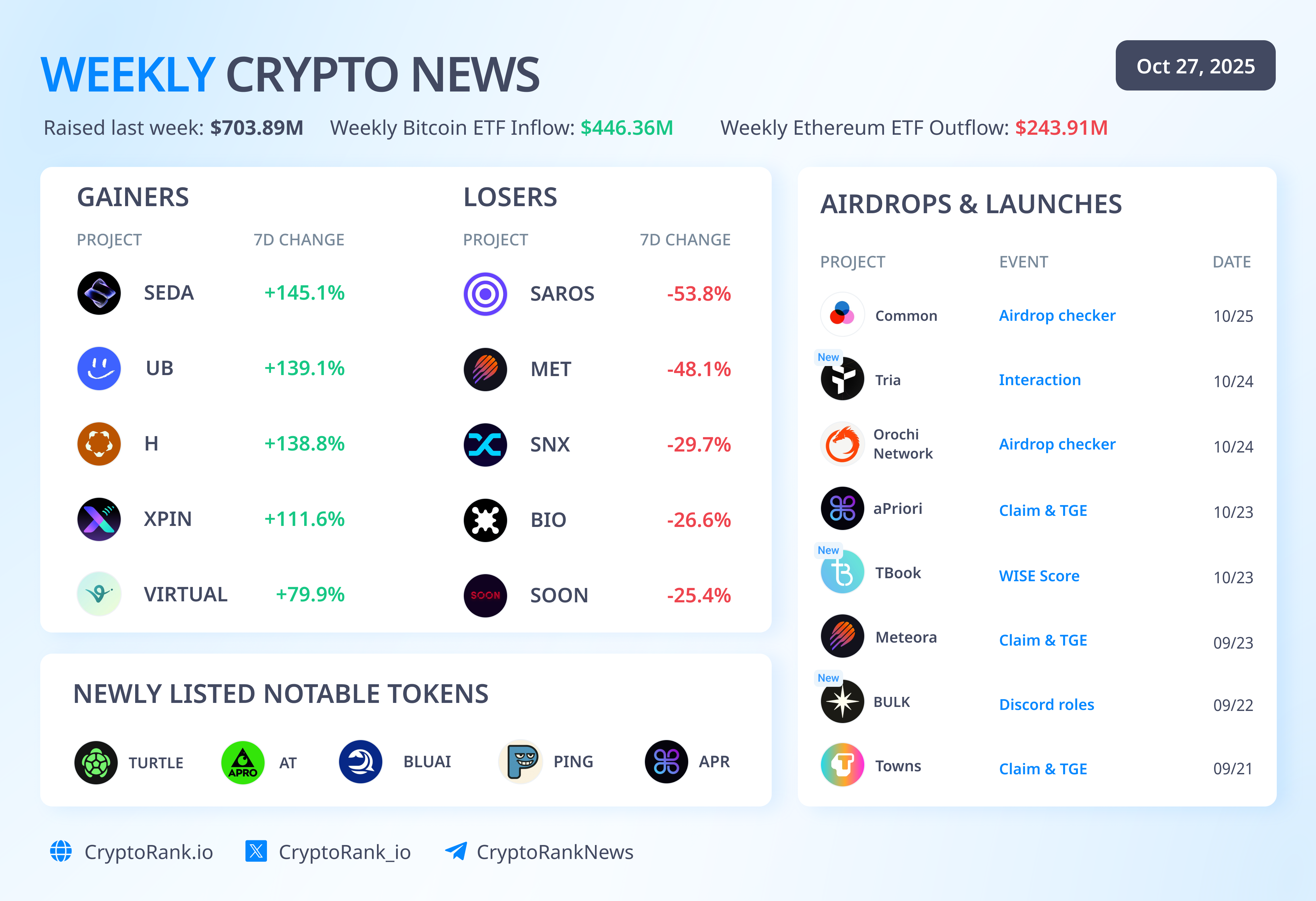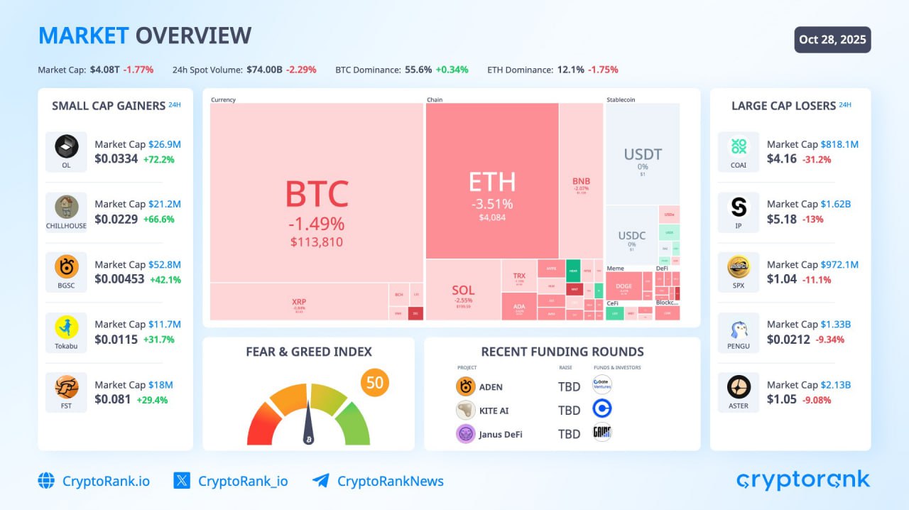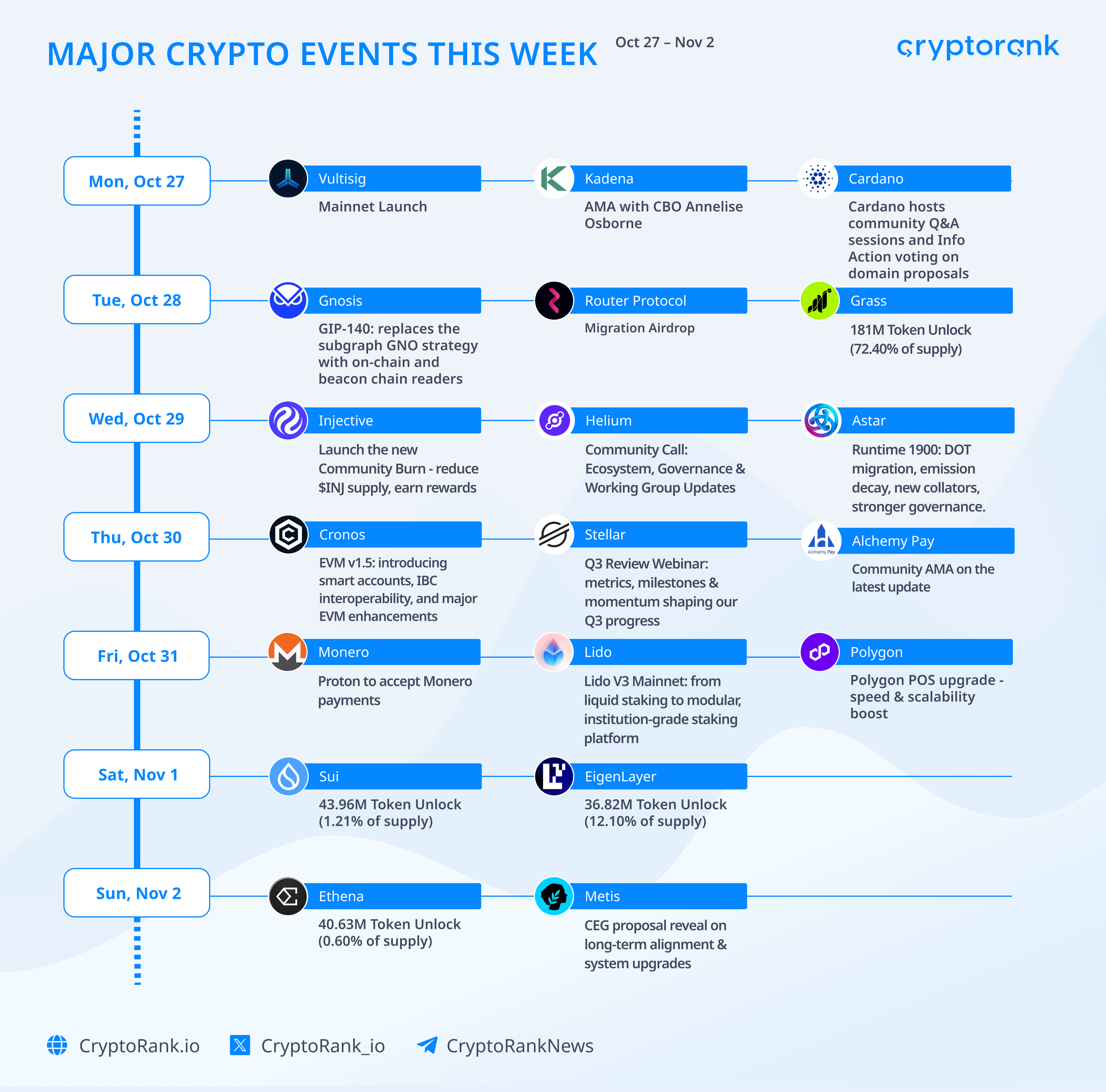 The crypto market seeks a bottom and rebound after a prolonged post-crash consolidation. Traders remain cautious, focus on equities, and are awaiting the FOMC meeting on Oct. 28–29.