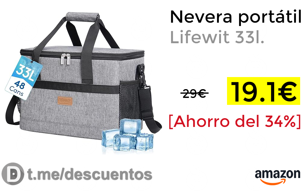 ✨Cupón de descuento para esta nevera portátil Lifewit, con 33 litros de capacidad. Cuenta con forro interior de PEVA y relleno de espuma de o mm para aislar totalmente el contenido. La parte exterior es de resistente tela Oxford 600D y cuenta con costuras termoselladas. Con correa de hombro y varios bolsillos.