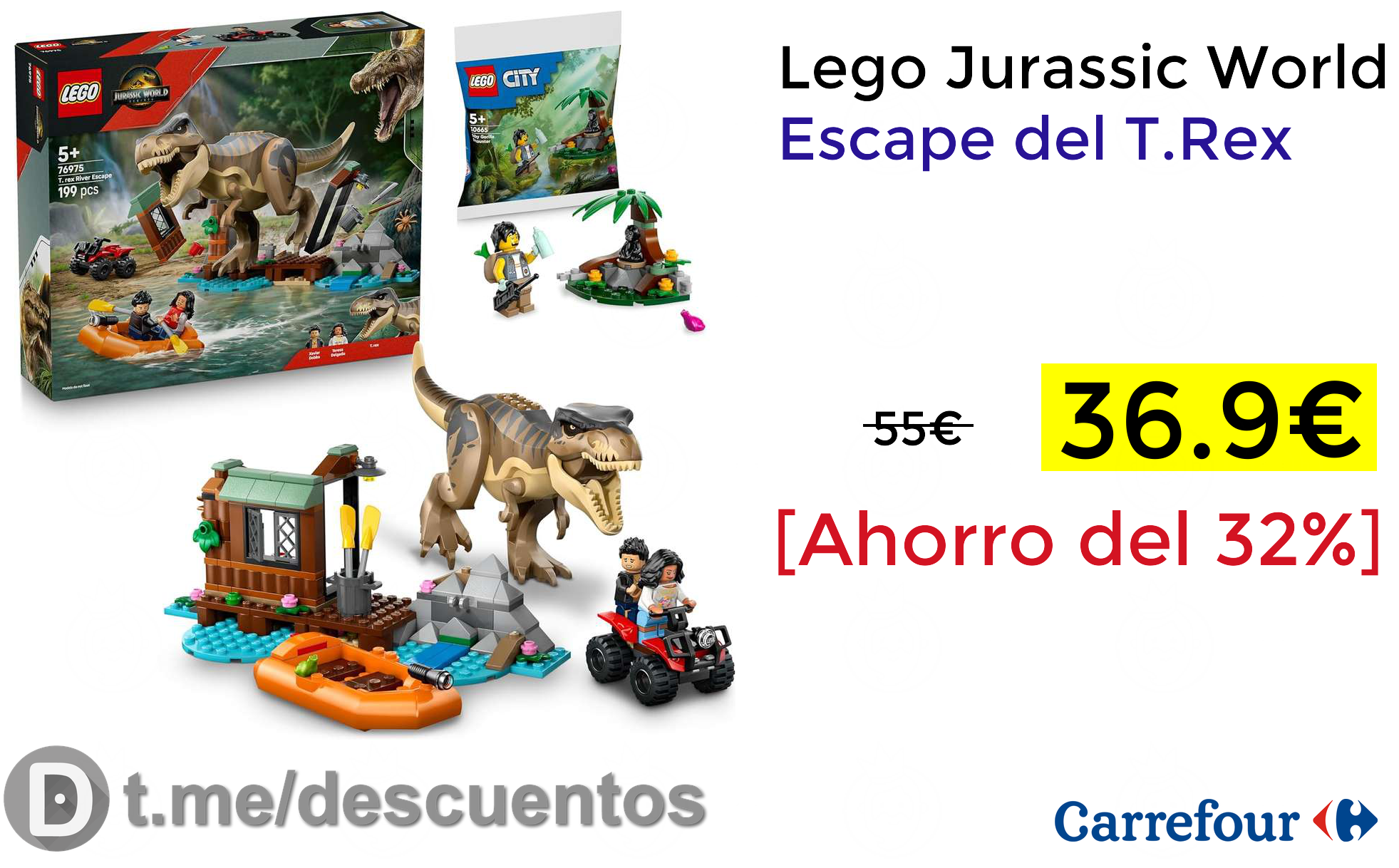 ✨Buen precio para este playset LEGO Jurassic World, el Escape del T. Rex con un total de 199 piezas,que sitúa la acción en una persecución protagonizada por el emblemático dinosaurio.