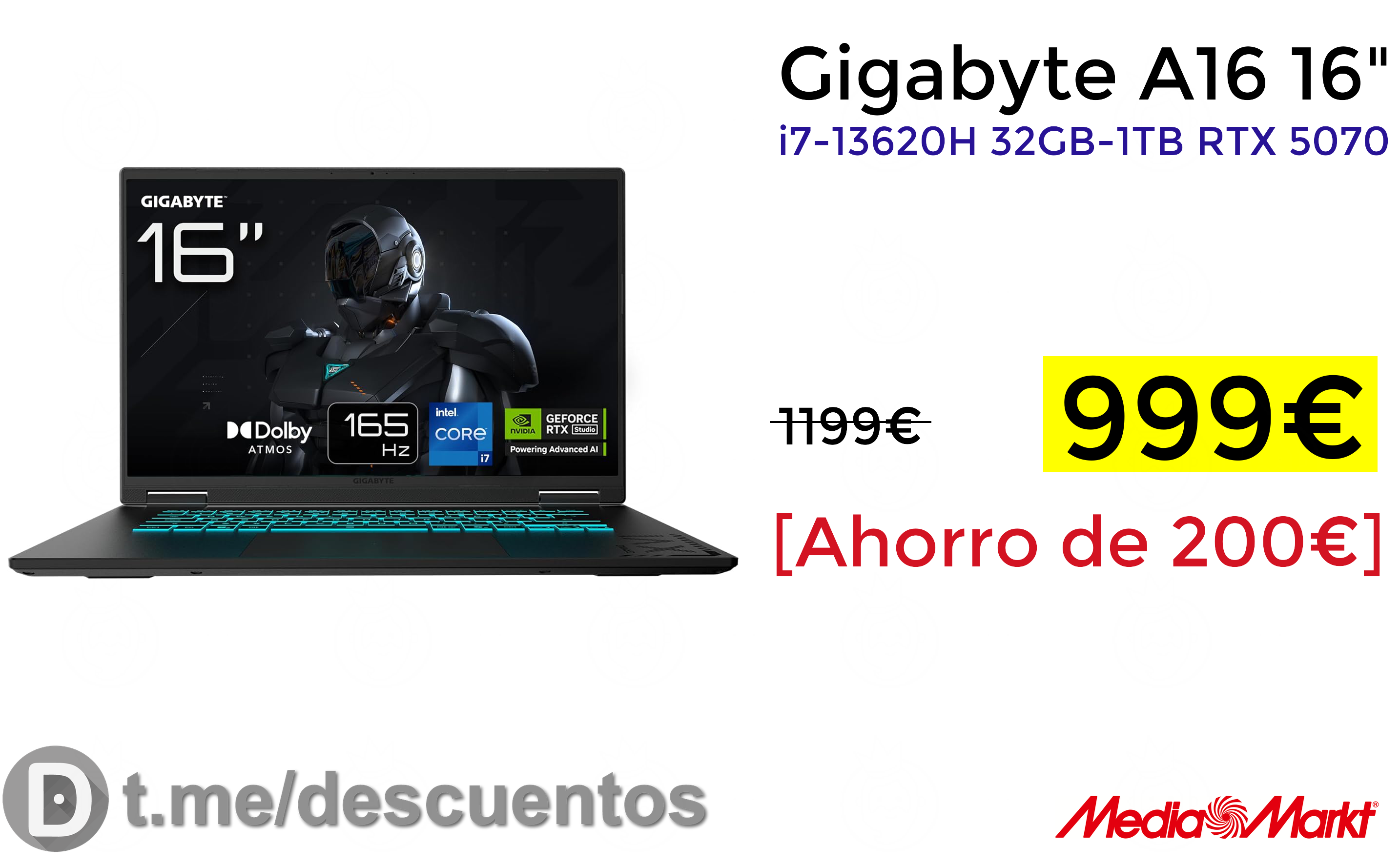 🔹Gigabyte A16 16" i7-13620H 32GB-1TB RTX 5070 solo 999€❗️⚡️ (PVP: +1199€)