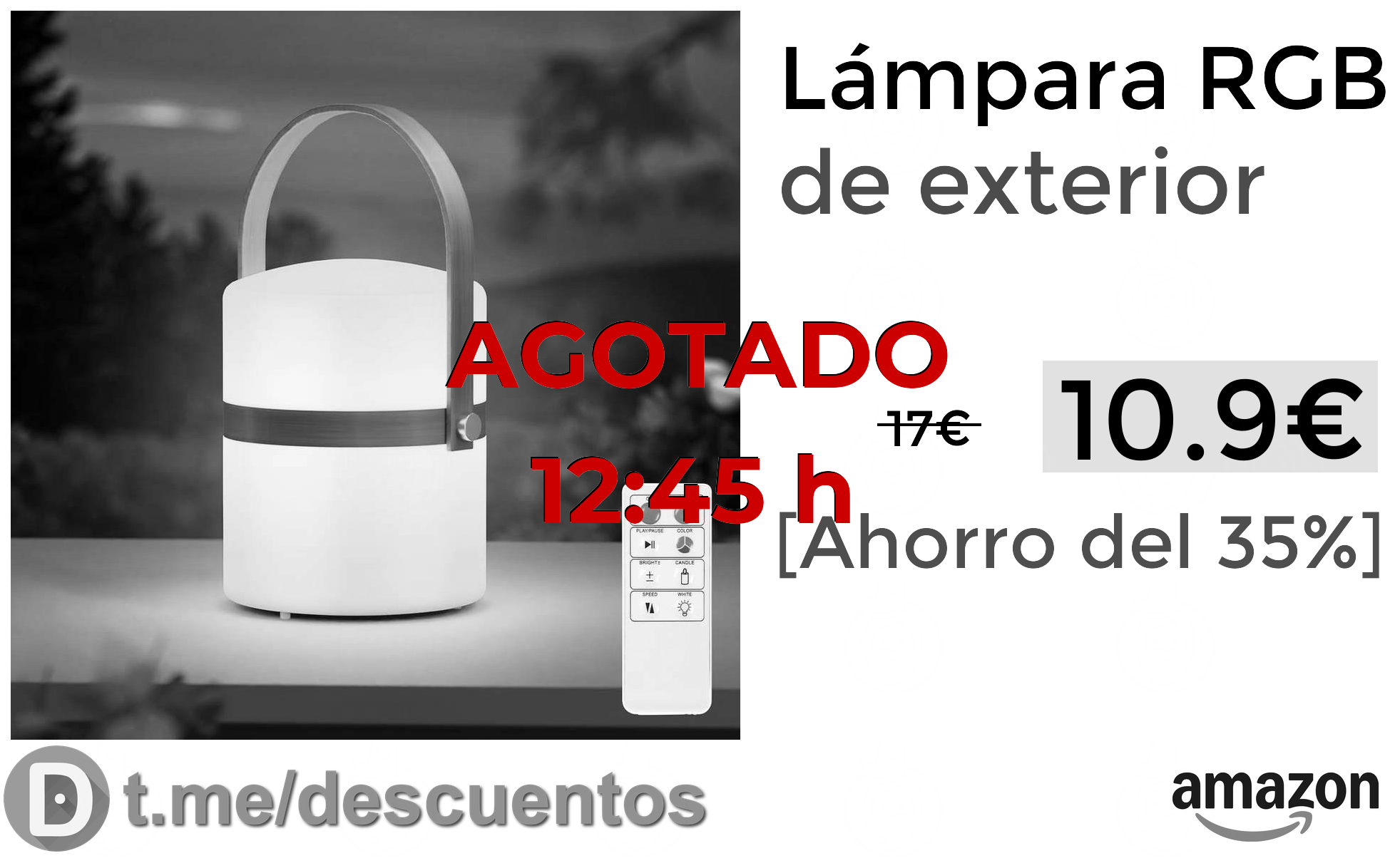 ✨Buen precio para esta lámpara ideal para poner en el exterior. Es inalámbrica, se controla mediante el mando a distancia que nos incluye y tiene asa. Dispone de 8 colores de iluminación distintos.