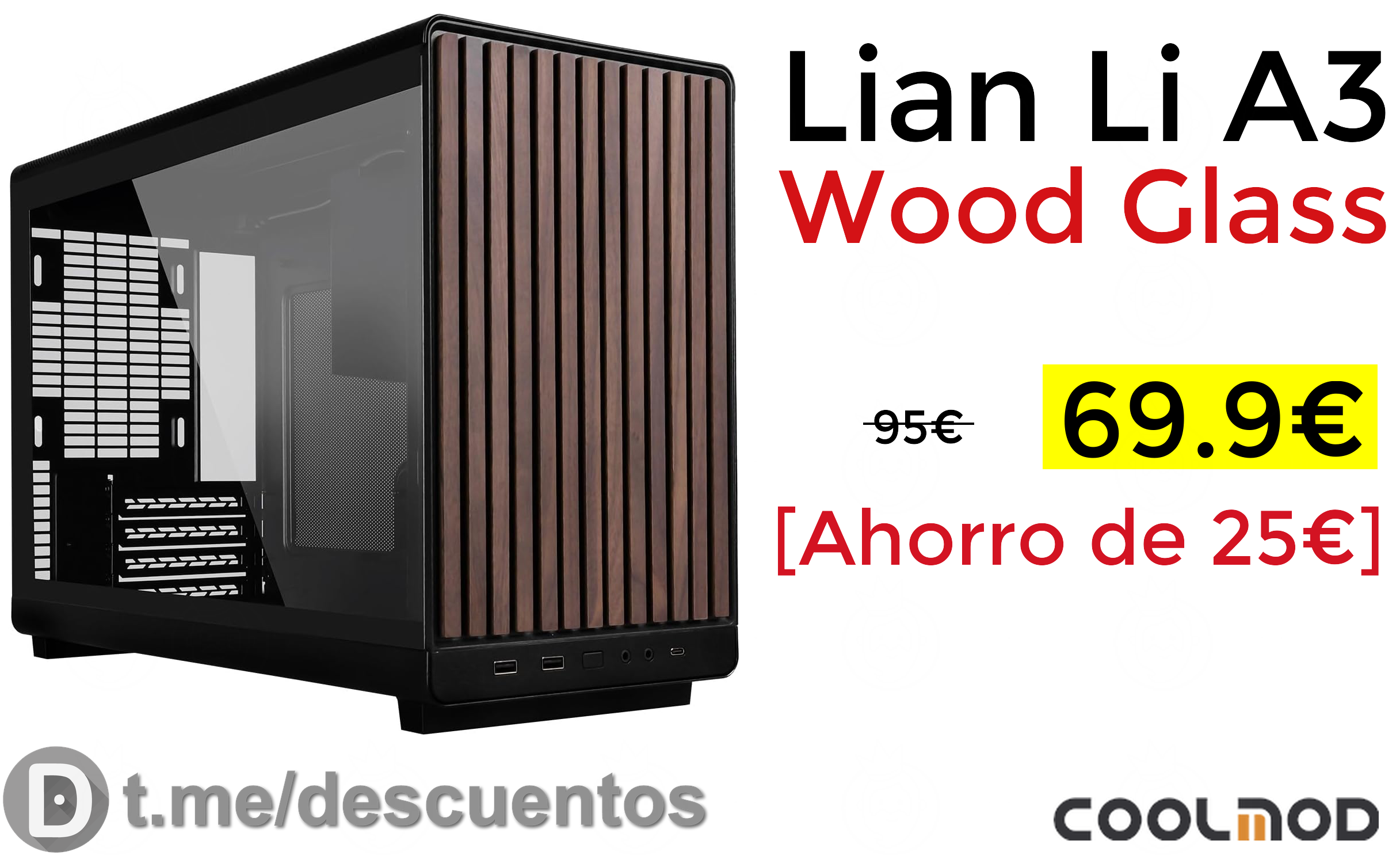✨Buen precio para esta caja de Lian Li. Es el modelo A3 de madera y cristal templado. Compatible con Micro ATX y Mini-ITX, capacidad para gráficas de hasta 415mm y un volumen de 26 litros. Envío de 5.94€).