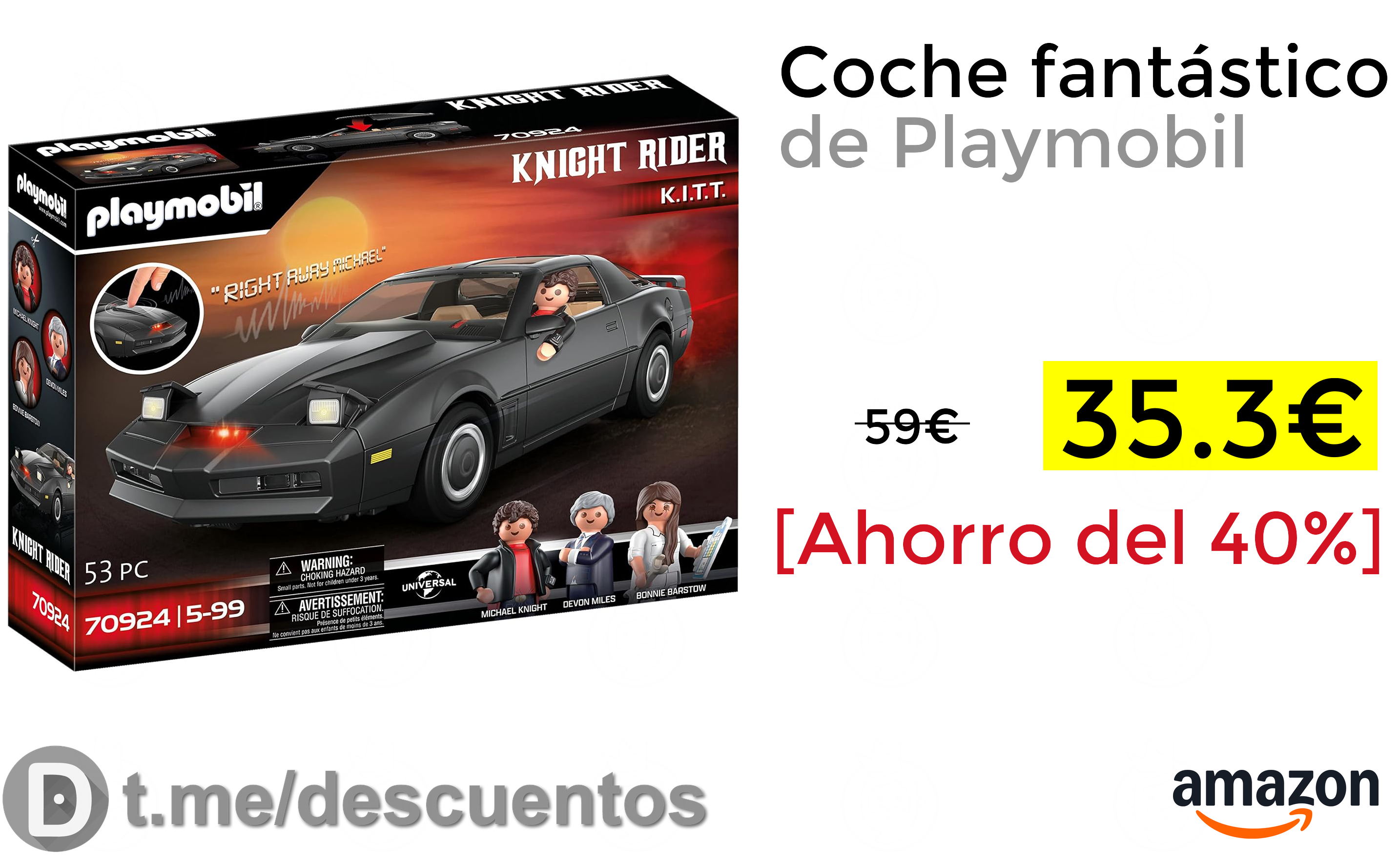 ✨Buen precio desde Amazon para este bonito Playmobil del coche fantástico. Cuenta con módulo de luz con sonido, 49 accesorios, techo extraíble, matrícula giratoria, faros plegables y con Michael Knight y Bonnie Barstow. Dimensiones aproximadas de 28x12x7.5cm