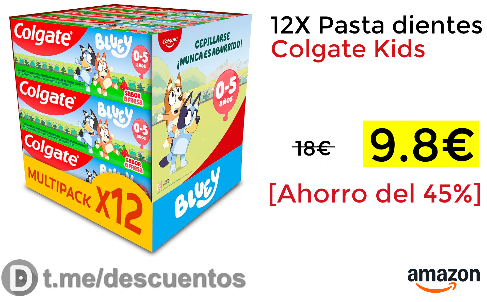 ✨Buen precio para este pack de 12 pastas de dientes Colgate Kids Bluey ideal para peques entre 0 y 5 años. Cada bote contiene 50 ml y tiene sabor a fresa.