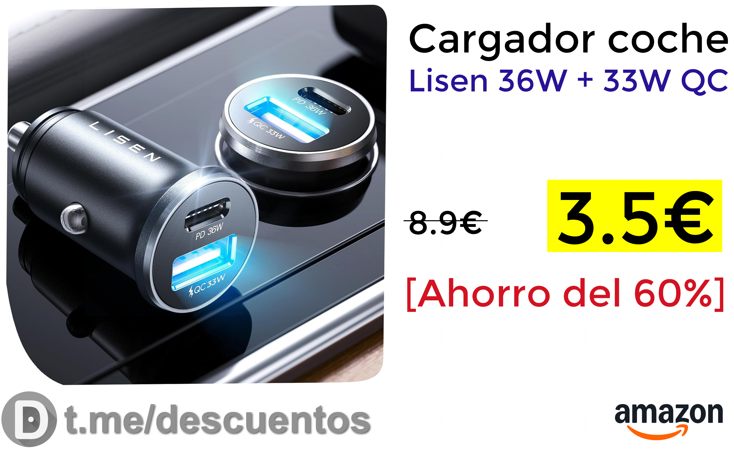 🔹Cargador coche Lisen 36W + 33W QC solo 3.5€❗️⚡️ (PVP: +8.9€)