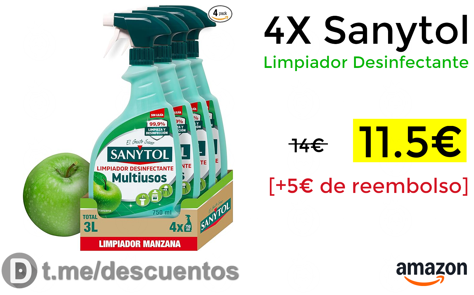 ✨Muy buena oferta en compra recurrente con reembolso de 5€ para este pack de 4 unidades de limpiador desinfectante multiusos Sanytol de 750ml por unidad, limpia y desinfecta sin lejía y de una sola pasada todo tipo de superficies, eliminando el 99,9% de los gérmenes y neutralizando los alérgenos.