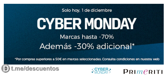 ✨Nueva promoción TOP en Primeriti por el Cyber Monday tienen un 30% de descuento EXTRA que aplica automáticamente en una gran selección de marcas siempre y cuando nuestro pedido sea igual o superior a 50€.