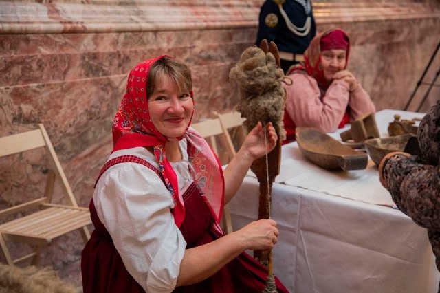 🌺Весь день в пространстве музея работали мастера традиционных поморских ремёсел из Архангельской области и Карелии. Орнаментальное вязание носок, вачег и бузурунок (рукавицы и вязаные поморские рубахи), чесание овечьей шерсти чипАхами и прядение на веретене, золотное шитьё и жемчужная вышивка, холмогорская резьба по кости и создание деревянной «птицы счастья» из щепы — этому удалые мастера учили всех желающих. Из бересты гости могли изготовить «кибас» — грузило для морских сетей, крепкое и долговечное.
