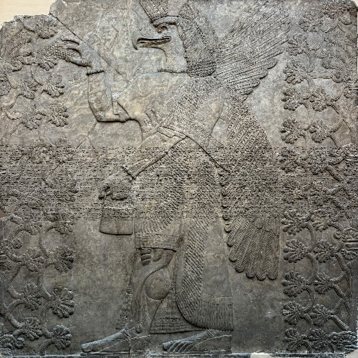 On a visit to the British Museum last week, Zihan Guo spotted this captivating relief in the Assyrian collection. You may not be able to see it upon first glance, but she was especially transfixed by the inscription running midriff on the eagle-head figure: