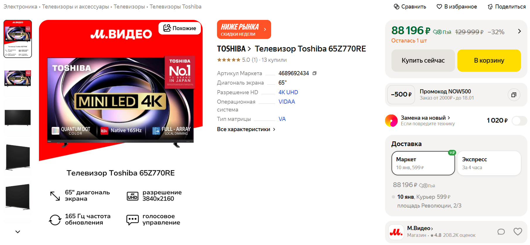 📺Toshiba 65Z770RE за 88 196 рублей при оплате картой «Пэй» на Маркете