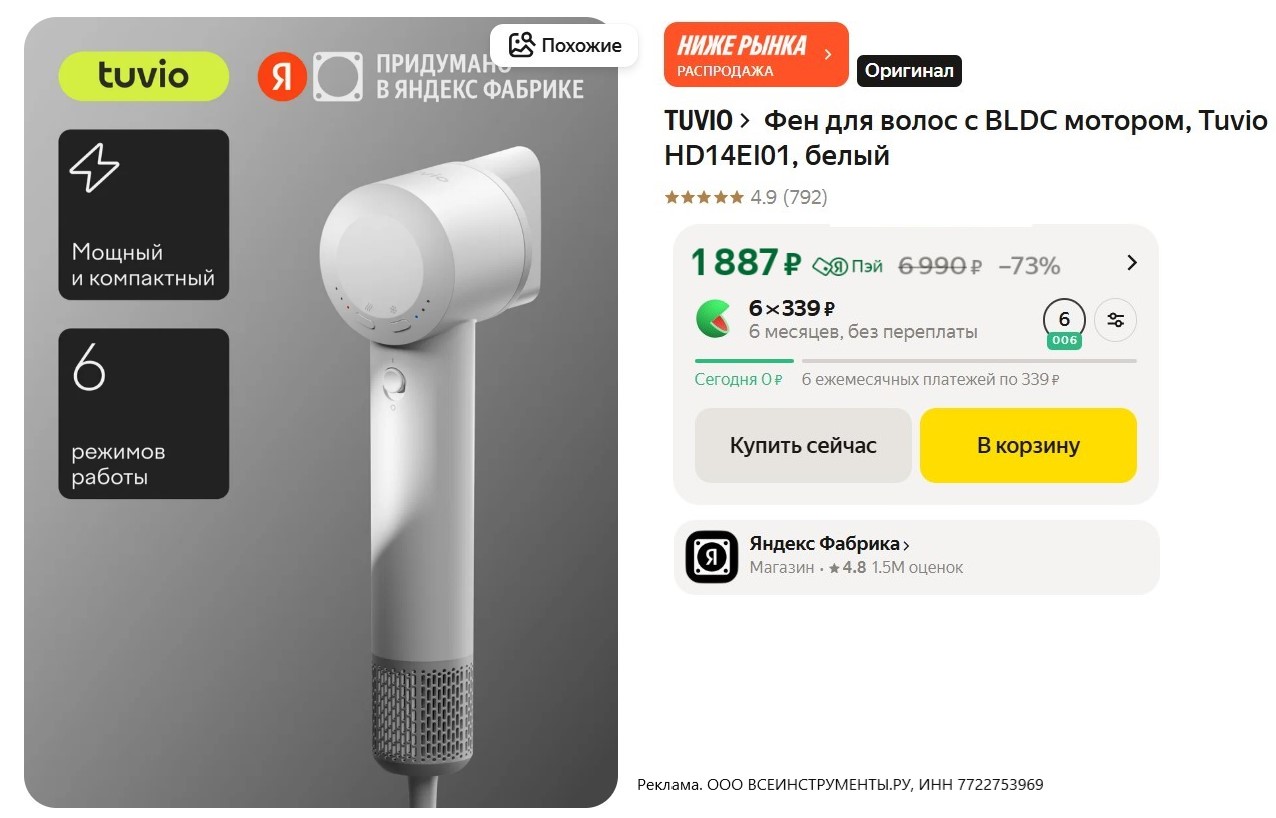 • Фен для волос Tuvio HD14EI01 за 1887₽. Везде от 2500₽. Мощность 1500 Вт, компактный, 3 температурных и 3 скоростных режима для различных укладок.