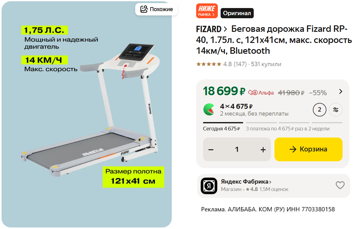 • Беговая дорожка Fizard RP-40 с кодом: FAST100-AF за 18600₽. Максимальная скорость 14 км/ч, система амортизации, 12 режимов тренировки, складывается с помощью гидроцилиндра.