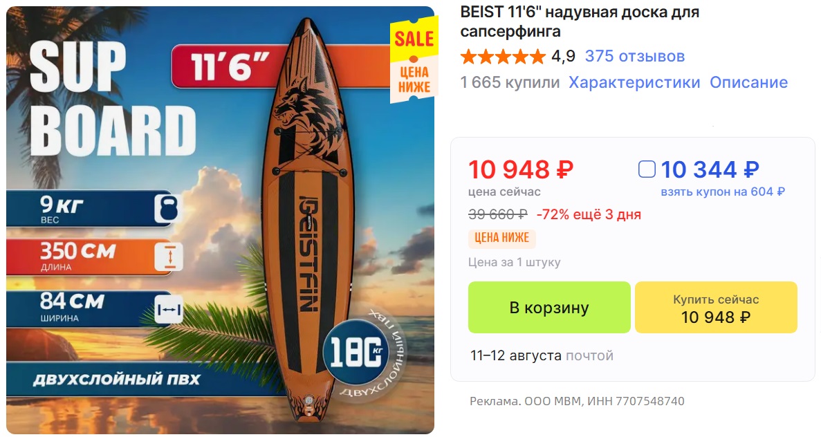 • Сап-борд BEIST 11'6" с купоном на 604₽ за 10344₽. Грузоподъемность 180 кг, полный комплект: насос, плавники, сумка, чехол для телефона.