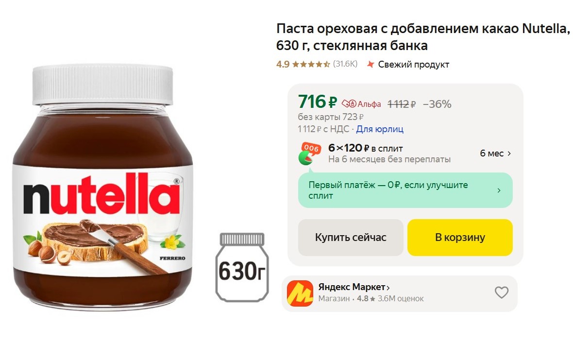 • Паста ореховая с добавлением какао Nutella, 630 г за 716₽. Обладает нежным вкусом и подойдёт для завтрака, а также приготовления тортов, бисквитов, капкейков.
