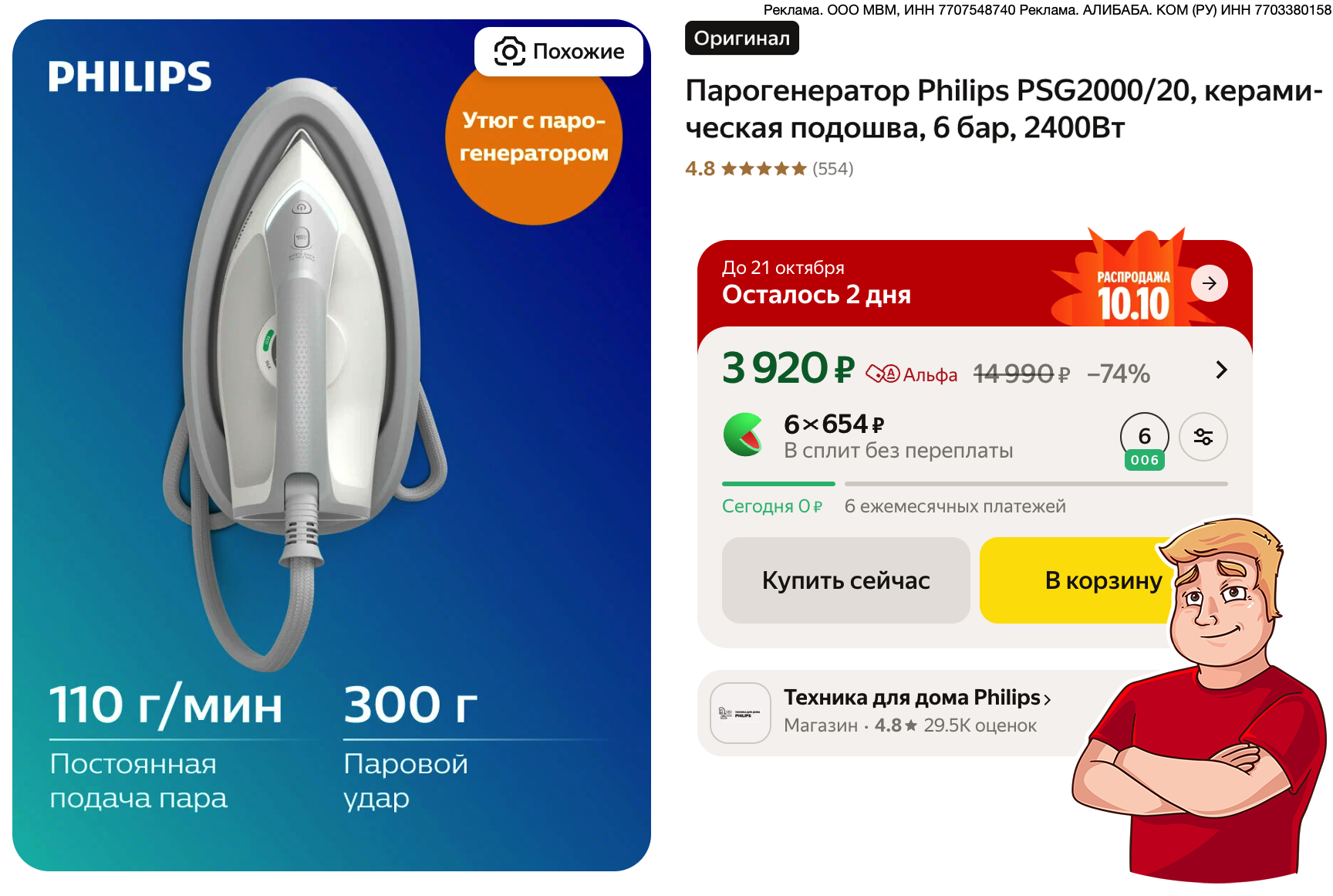 • Парогенератор Philips PSG2000/20 за 3920₽, обычно около 5000₽. Мощность 2400 Вт, керамическая подошва с антипригарным покрытием, контейнер объёмом 1.4 л.