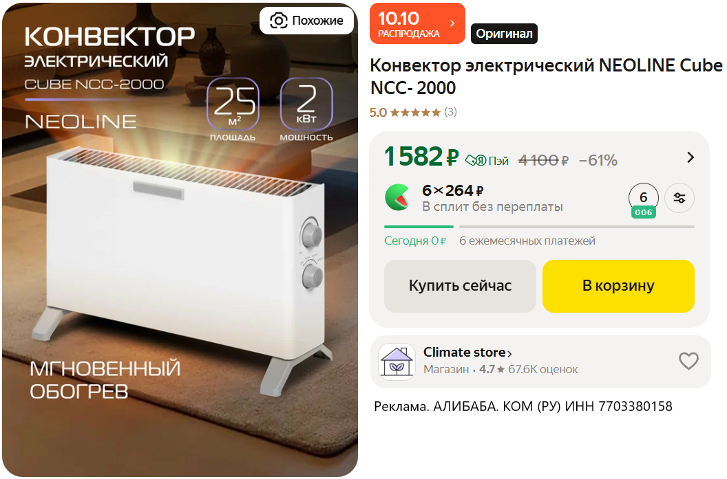 • Конвектор электрический NEOLINE Cube NCC-2000 за 1582₽. Работает в 3 режимах, рассчитан на площадь до 25 м², мощность 2000 Вт, защита от перегрева и опрокидывания.