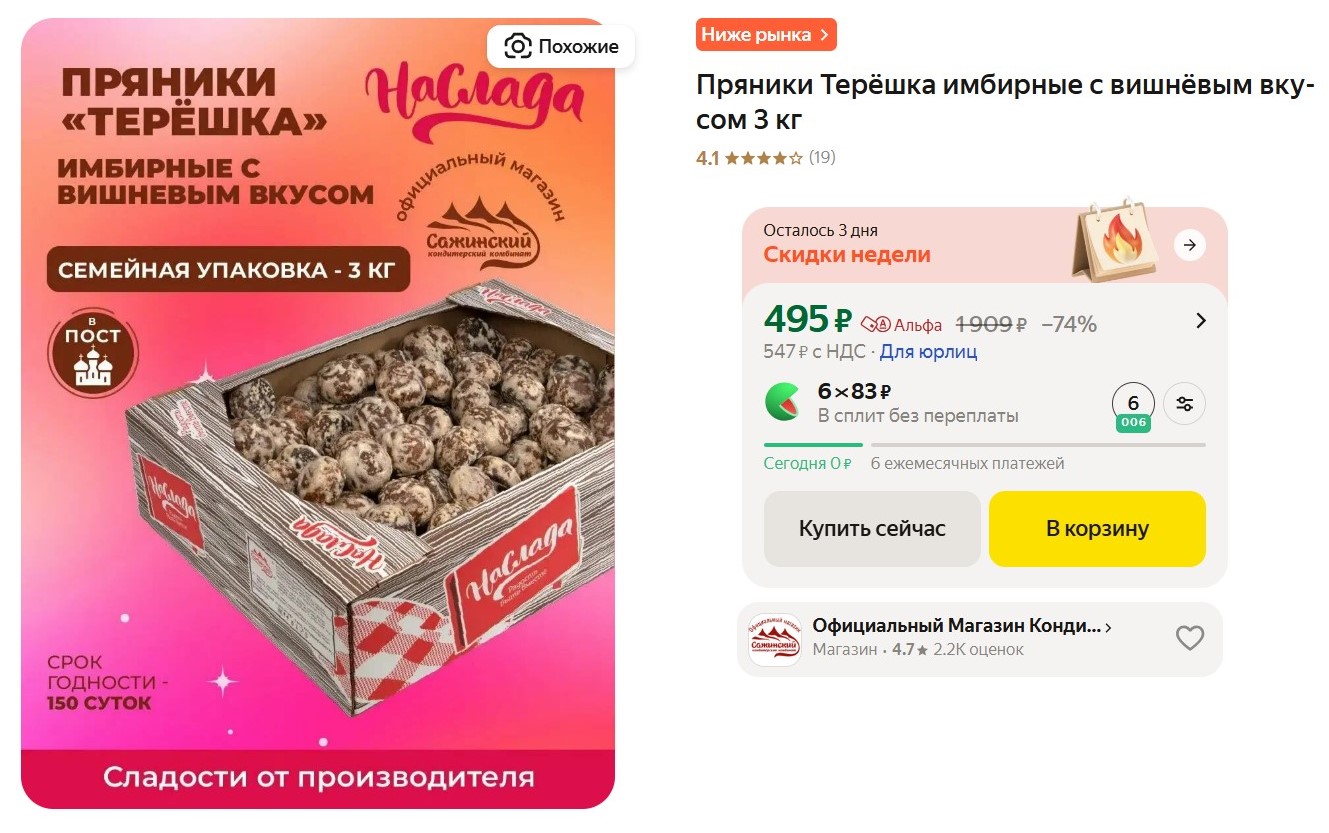 • Пряники Терёшка имбирные с вишнёвым вкусом, 3 кг за 495₽. В составе натуральные специи, инвертный сироп, мука, сахар и вода.