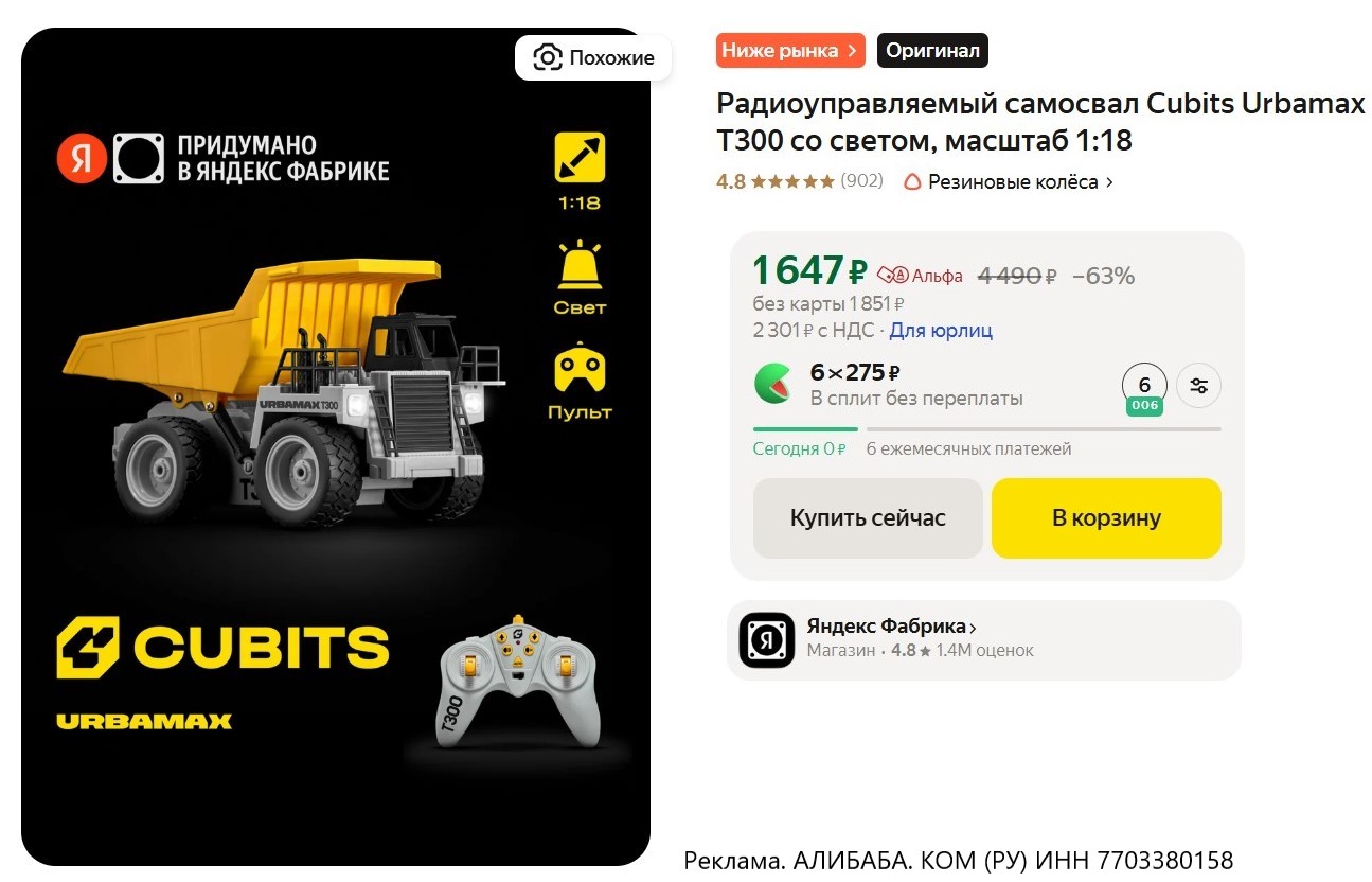 • Радиоуправляемый самосвал Cubits Urbamax T300 за 1647₽. Кабина из металла, кузов с гидравлической системой, есть световые эффекты, может двигаться в разных направлениях, масштаб 1:18.