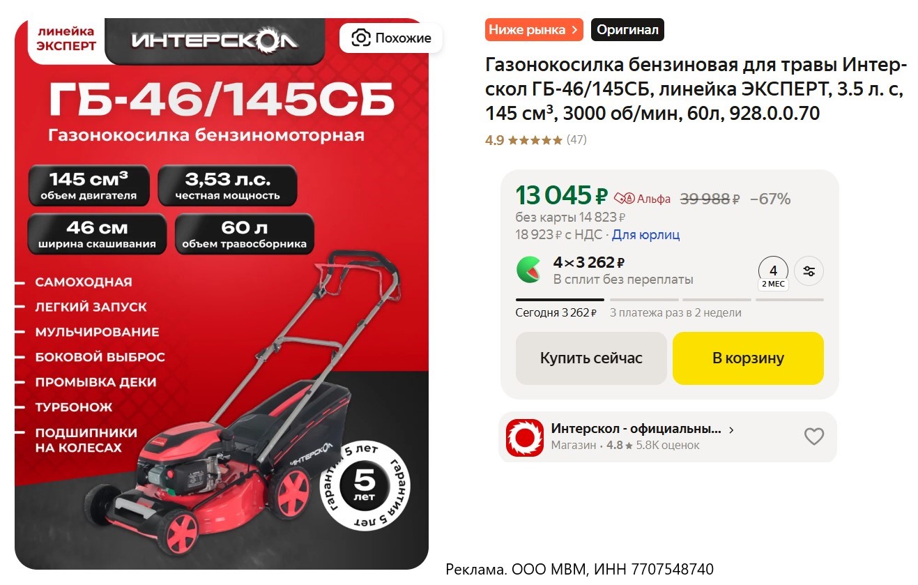 за 12957₽. Мощность 3.5 л.с, объём травосборника 60 л, рубит даже жёсткую траву и молодые побеги, 7 уровней высоты скашивания. В других от 18000₽.