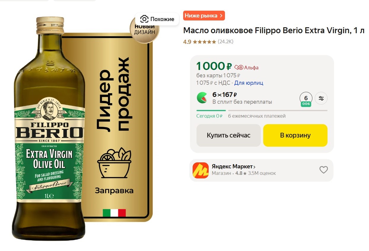 - Масло оливковое Filippo Berio Extra Virgin, 1 л за 904₽
