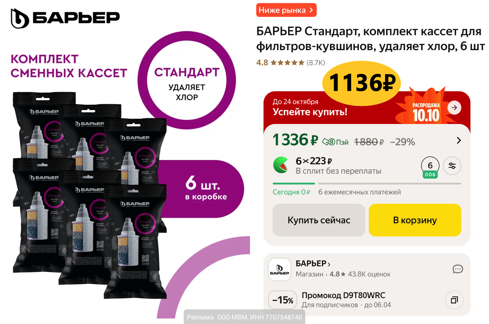 за 1136₽ при подписке на магазин. Ресурс кассеты 350 л, очищают от хлора, металлов и неприятных запахов. Подходят к любому кувшину БАРЬЕР.