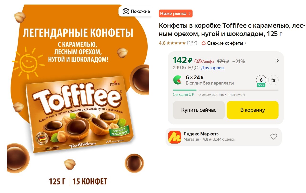 • Конфеты в коробке Toffifee, 125 г за 142₽. Хрустящие карамельные чашечки со свежим ядрышком лесного ореха, нежной нугой и шоколадом.