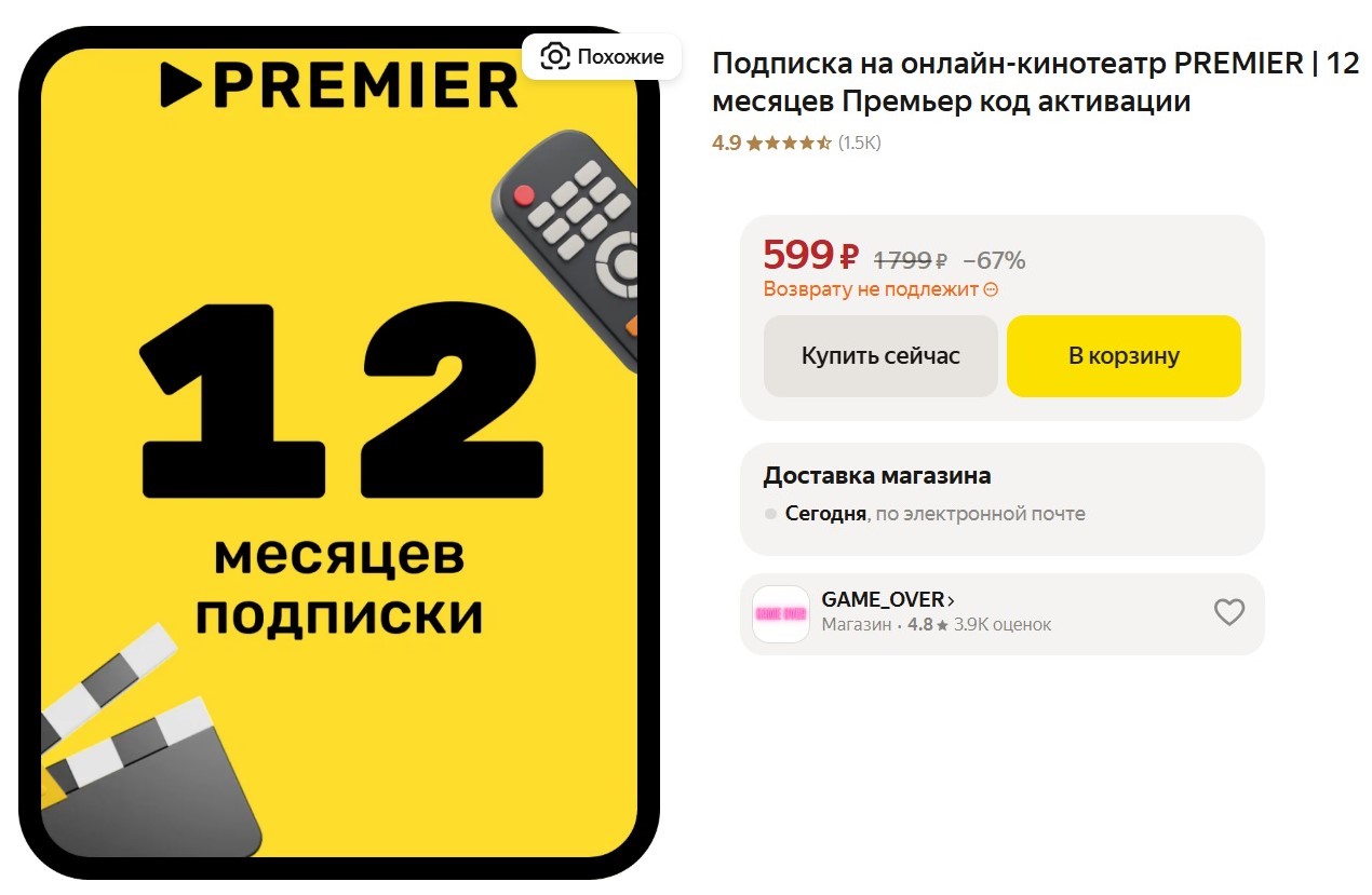 • Подписка на онлайн-кинотеатр PREMIER 12 месяцев за 599₽. Получишь доступ к сериалам, фильмам, шоу, эксклюзивному контенту в высоком качестве. А если нет активной подписки, сначала активируй код на 50 дней за 1₽.