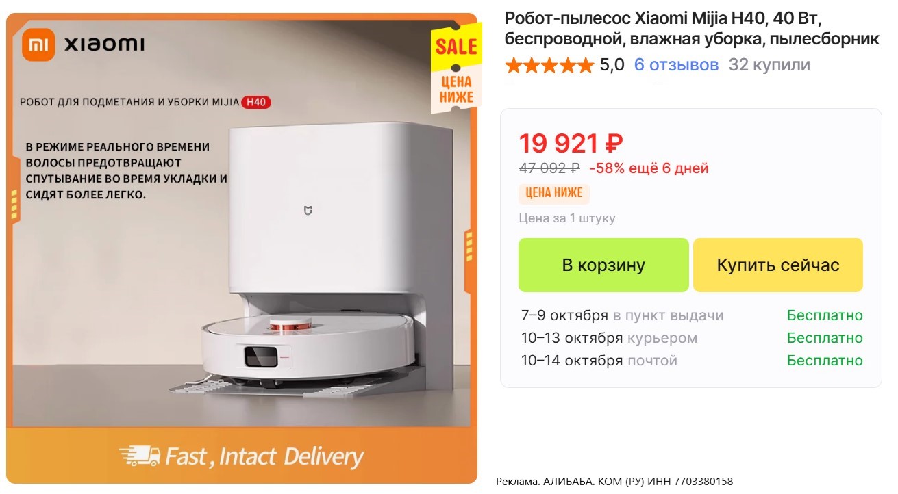 • Робот-пылесос Xiaomi Mijia H40 за 19921₽. В РФ такие от 27000₽. Оснащен мощным всасыванием 6000 Па и функцией влажной уборки с резервуаром на 4 л. Он автоматически поднимает швабры над коврами и возвращается на док-станцию для их очистки, обеспечивая комплексную уборку площадей до 500 м².