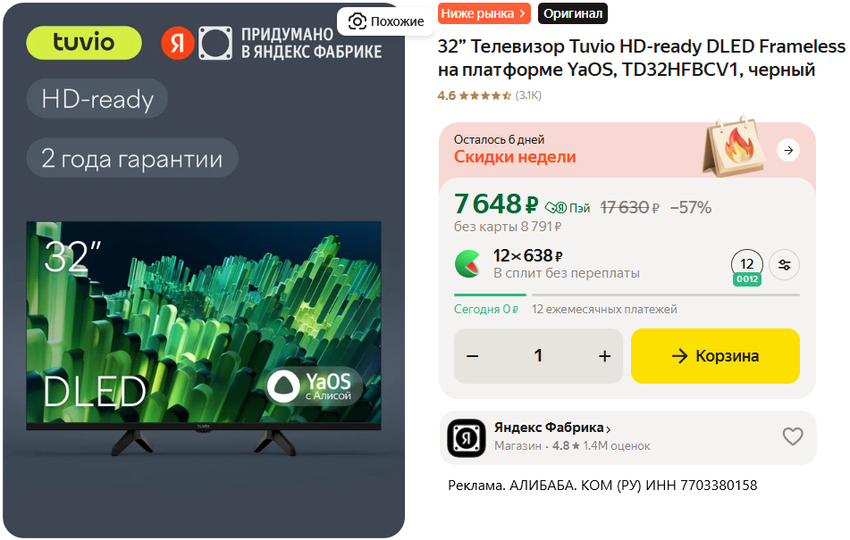 за 7561₽. Безрамочный экран 32", ОС YaOS, динамики общей мощностью 20 Вт, встроенный модуль Wi-Fi, защита от детей и таймер сна.