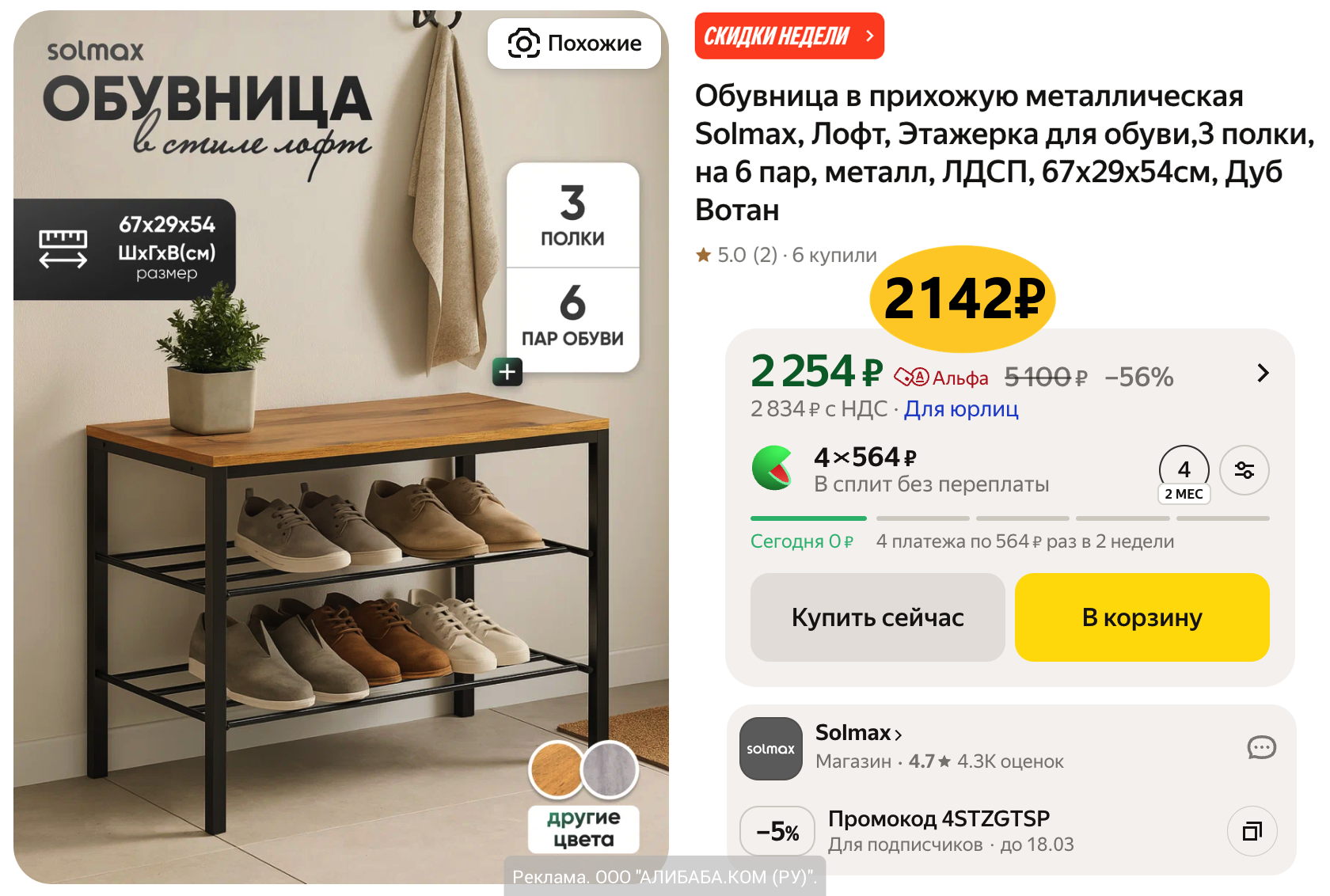 • Обувница в прихожую металлическая Solmax, Лофт с кодом: 4STZGTSP за 2142₽ при подписке магазин. Размер 67x29x54 см, изготовлена из ЛДСП и металла, вмещает 6 пар обуви.