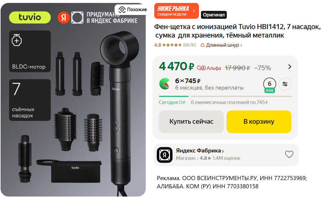 • Фен-щётка с ионизацией Tuvio HBI1412 за 4470₽. Имеет 3 скорости и 3 температурных режима, мощность 1500 Вт, 7 съёмных насадок для разных укладок и сумка для хранения.
