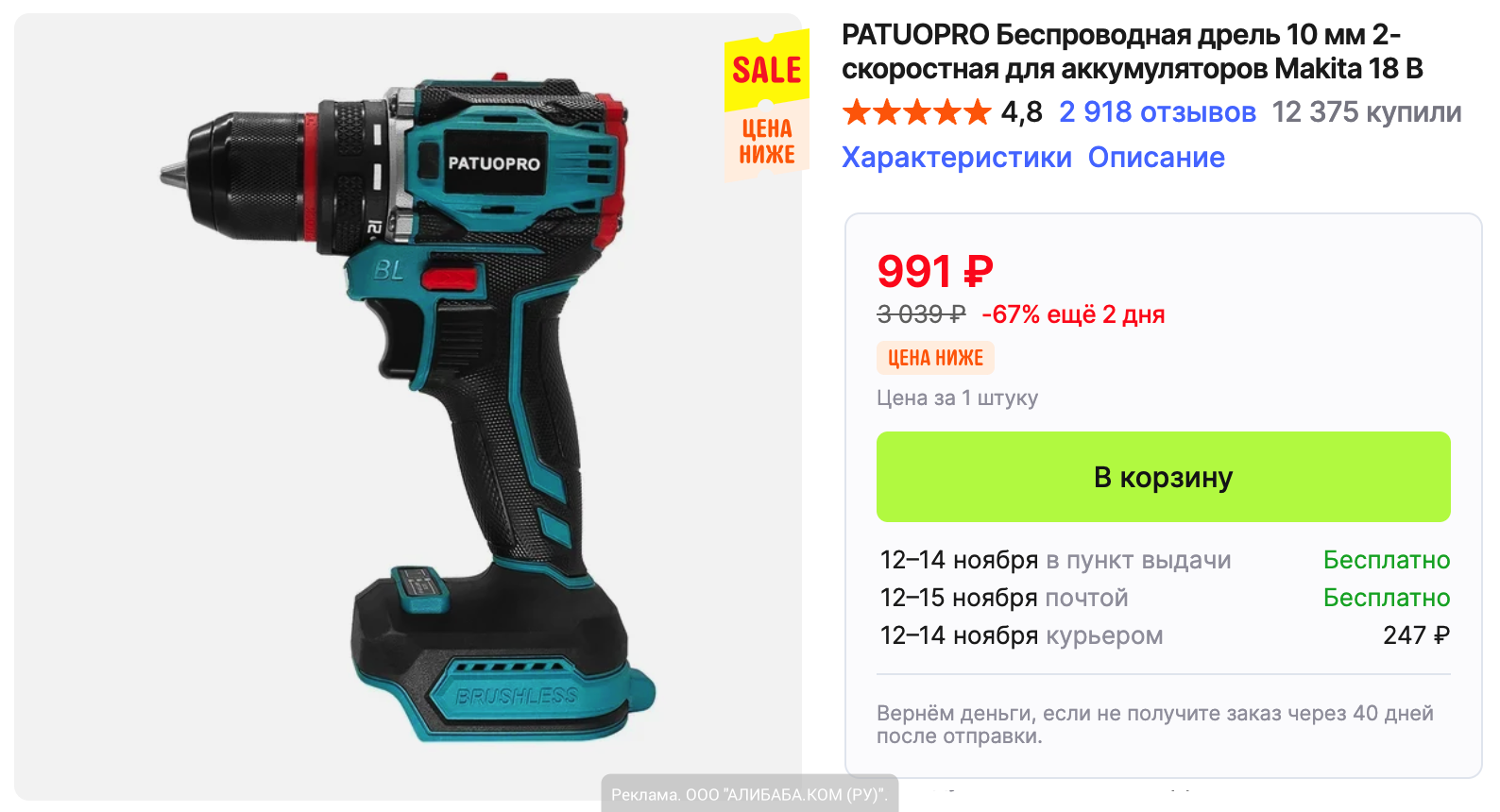 • Беспроводная дрель-шуруповёрт PATUOPRO за 991₽ с экспресс доставкой. Скорость до 2200 об/мин, 2 режима, быстрозажимной патрон, совместима с АКБ Makita 18V.