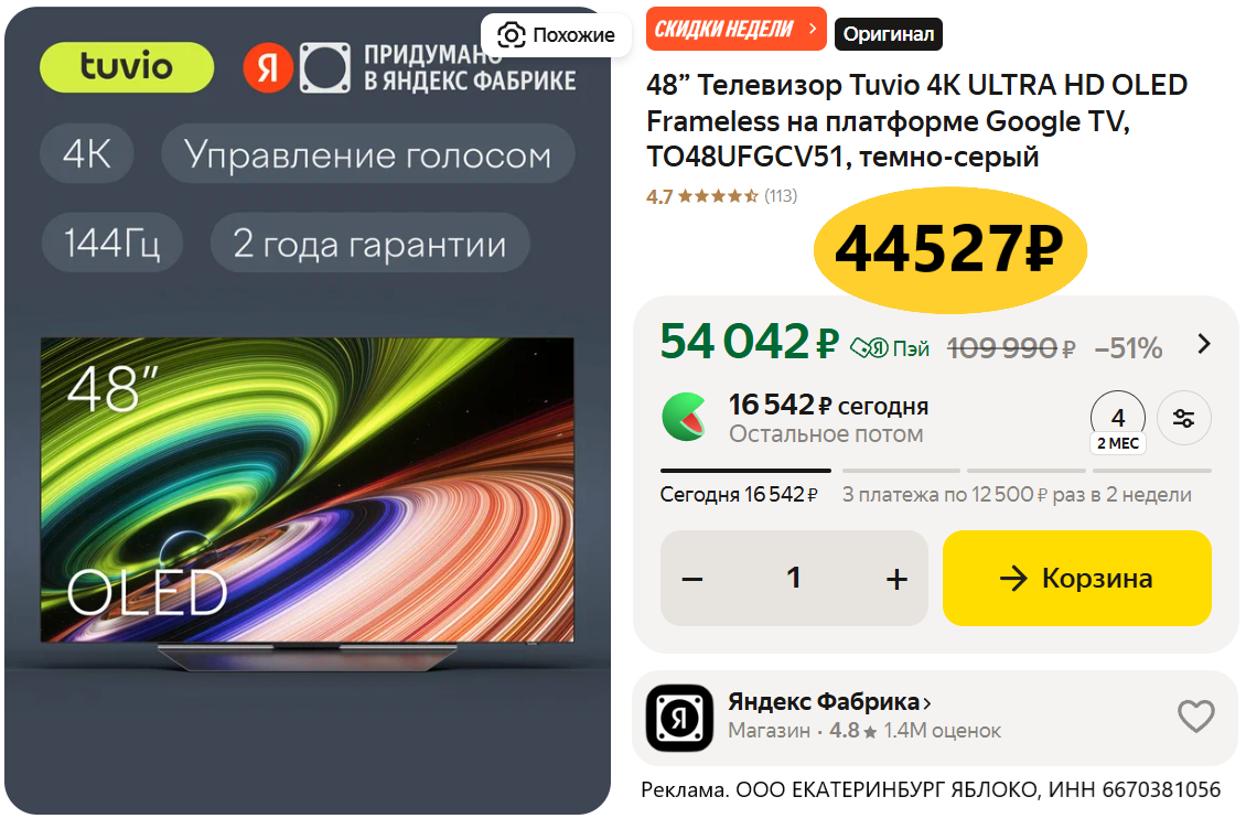 • Надо брать! Цена меняется в корзине! Телевизор Tuvio 4К ULTRA HD OLED, TO48UFGCV51 за 44527₽. Экран 48" с частотой обновления 144 Гц, ОС Google TV, встроенный модуль Wi-Fi.