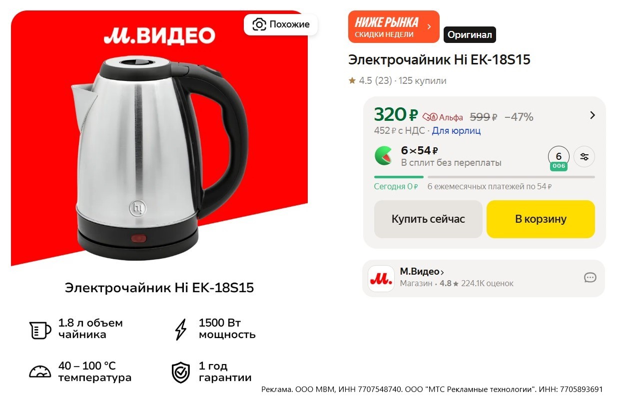 • Электрочайник Hi EK-18S15 за 330₽. Мощность 1500 Вт, объём 1.8 л, корпус из нержавеющей стали, автоотключение при закипании, защита от включения без воды и перегрева.
