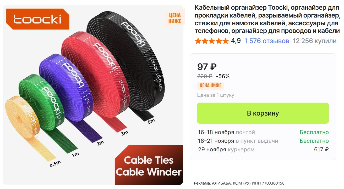 • Кабельный органайзер Toocki за 97₽. Поможет собрать провода в один пучок. Многоразовый, ширина 1 см, длина 5 м, застёгивается на липучку. На выбор 5 цветов.