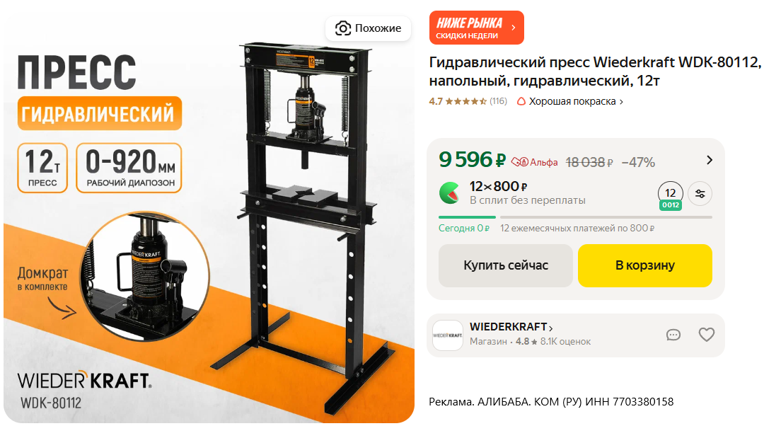 • Гидравлический пресс Wiederkraft WDK-80112 с кодом: HLV100-AF за 9529₽. Усилие 12 т, рабочий диапазон 0-920 мм, ход штока 175 мм, ручной гидравлический привод, возможна запрессовка подшипников.