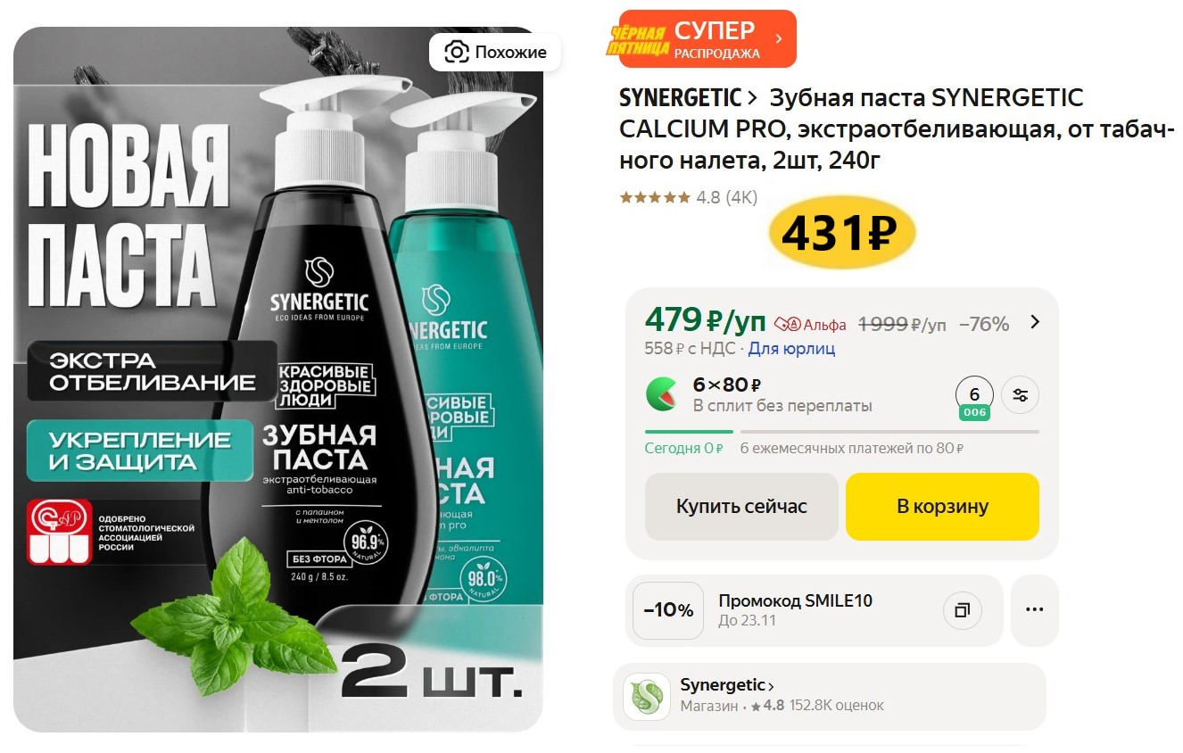 • Зубная паста SYNERGETIC CALCIUM PRO, экстраотбеливающая, 2х240 г с кодом: SMILE10 за 431₽. Формулы с папаином и гидроксиапатитом для бережного осветления эмали и укрепления десен. Другие наборы: https://hlv.su/1xbee